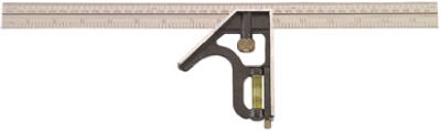 16" zinc combination square, cast zinc head with computer machined gauging edges for greater accuracy, acrylic yellow barrel vial, hardened, removable scriber, steel blade with protective anti rust coating is permanently stamped in 1/8", 1/32" & metric graduations.
