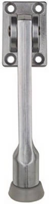 5" satin chrome kick down door stop, designed as a door stop that kicks down to hold the door open, the stop locks in the up position to allow the door to open freely, ribbed rubber foot for positive holding.