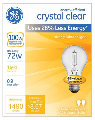 This 72 watt Halogen A-line bulb has a medium base. The bulb is clear and give the same lumen output as a 100 watt incandescent. The bulb is 3" long and has a 1,000-hour rated life. This is a 2 pack.